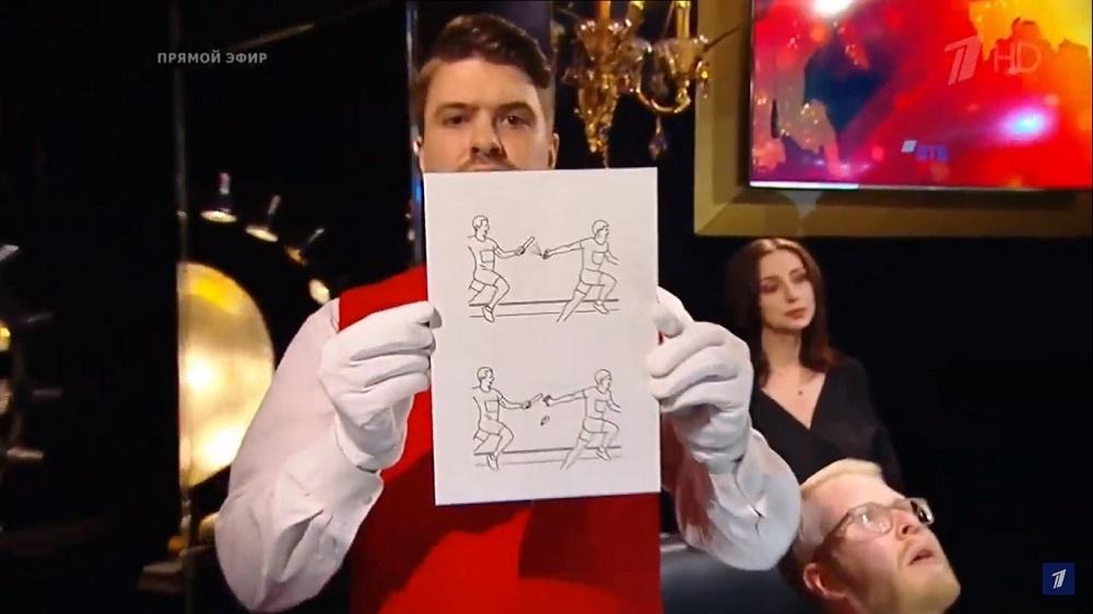 После совещания и истечения времени дать правильный ответ вызвался капитан команды Борис Белозеров. Он ответил, что в руках у легкоатлета был мусор. Ведущий программы рассказал, что ответ неправильный, а карикатура отражает актуальную на сегодня тему – коронавирус и правила гигиены.