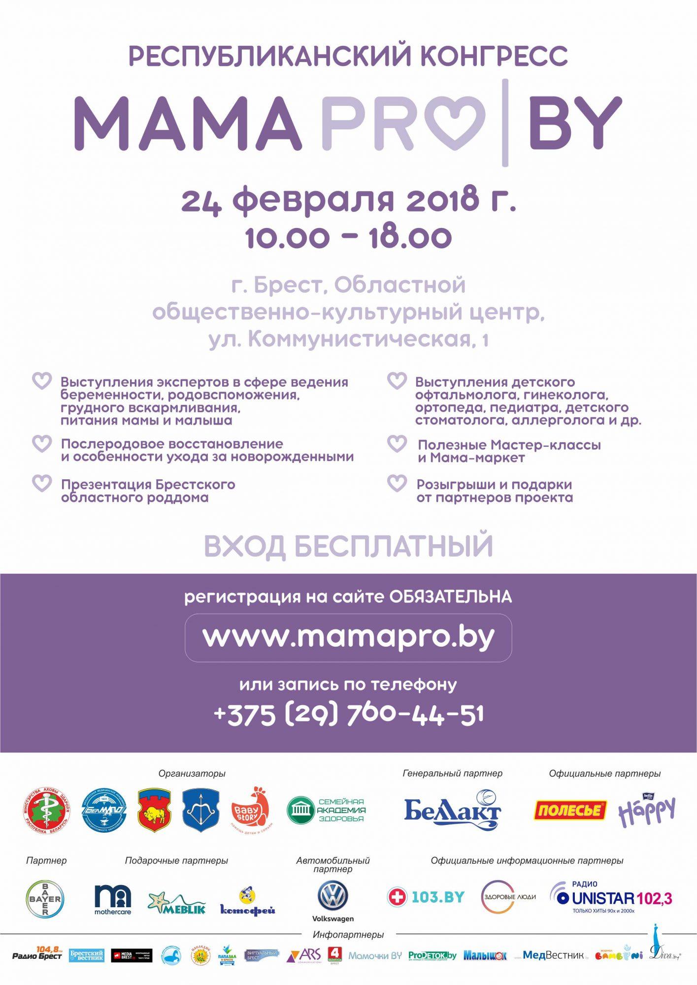 В субботу 24 февраля в Брестском областном общественно-культурном центре (ул. Коммунистическая, 1) состоится республиканский конгресс «Мама Pro», который с успехом прошел в Минске и Могилеве в конце прошлого года. Во время него у будущих и состоявшихся родителей есть уникальная возможность впервые встретиться на одной площадке с представителями роддома, женских консультаций, широким кругом экспертов в сфере детского и женского здоровья и развития.