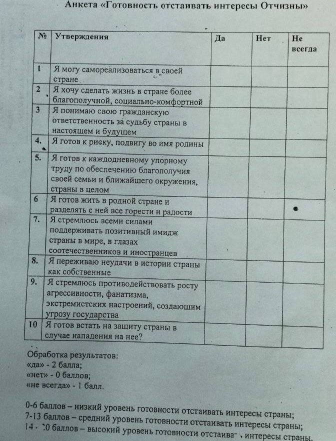 Вопросов в анкете десять, некоторые из них связаны с войной — учеников спрашивали, готовы ли они рисковать и совершать подвиг «во имя родины», «встать на защиту страны в случае нападения на нее». Остальные, судя по всему, проверяют «уровень патриотизма» среди молодежи.
