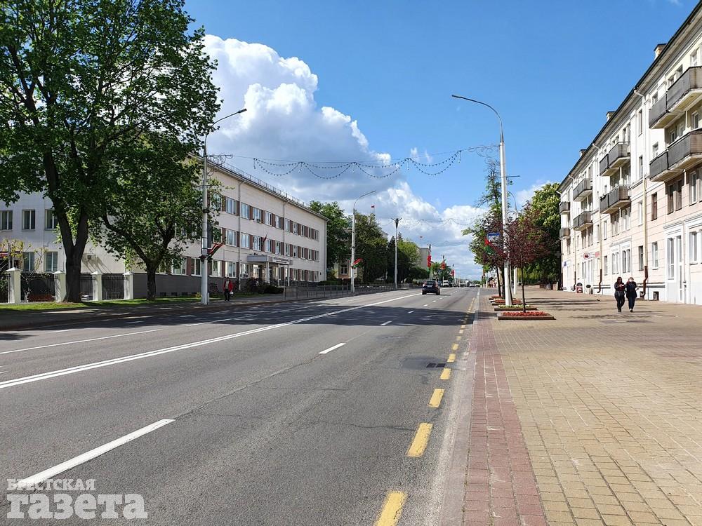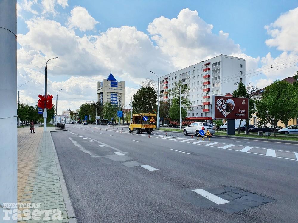 В четверг 7 мая в Бресте обновляли дорожную разметку на главных улицах. Корреспондент «БГ» застала работников дорожных служб в этот день на улице Ленина и на проспекте Машерова.