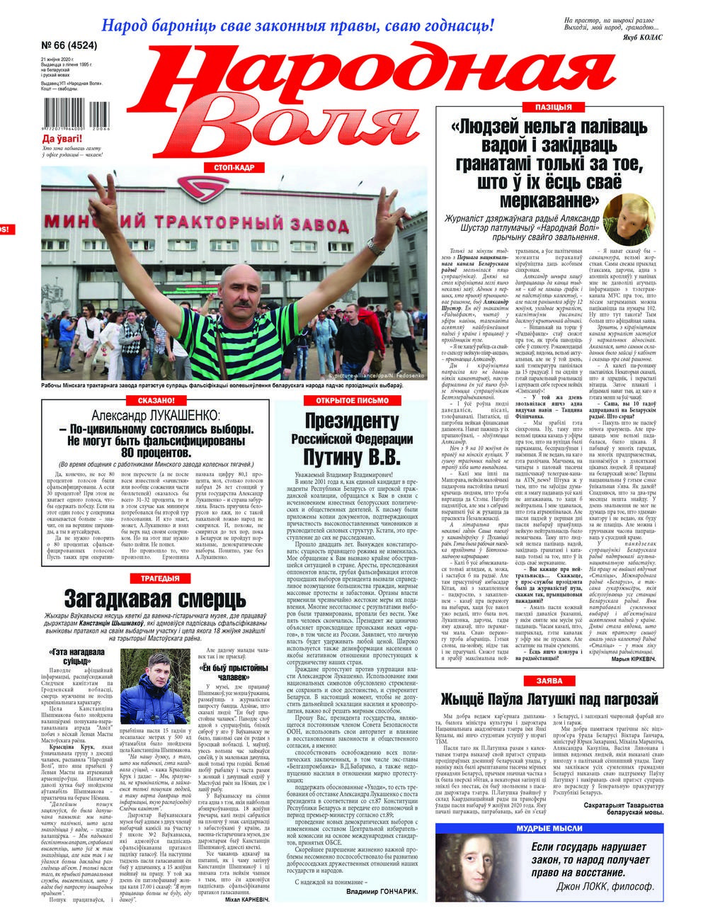 Это независимое издание первым столкнулось с «проблемами» в Белорусском доме печати. Номера газеты за 18 и 20 августа не были напечатаны. Выпуски за 21, 22, 25 и 27 августа удалось отпечатать в российской типографии. Сейчас номера газеты можно забрать в редакции в Минске (ул. Платонова, 1 Б) или искать в торговых сетях. Редакция решает вопрос с доставкой газет подписчикам.