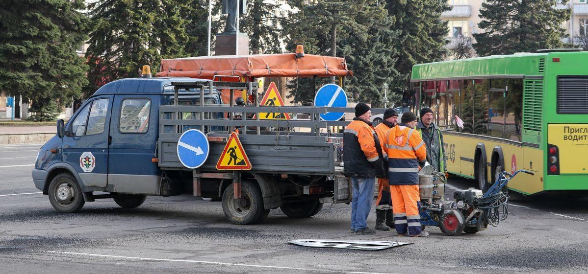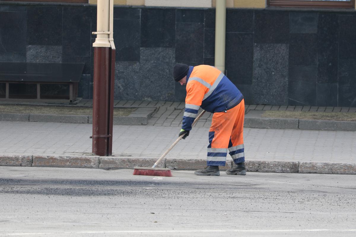 Днем 20 марта активнее всего велись работы в центре города. На дороги наносили новую дорожную разметку, красили столбы и заборы, мыли окна и козырьки зданий.