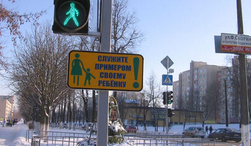 Согласно изменениям, на пешеходных переходах около школ, детсадов и детских поликлиник будут размещаться знаки с изображением матери и ребенка с надписью: «Служыце прыкладам свайму дзіцяці».