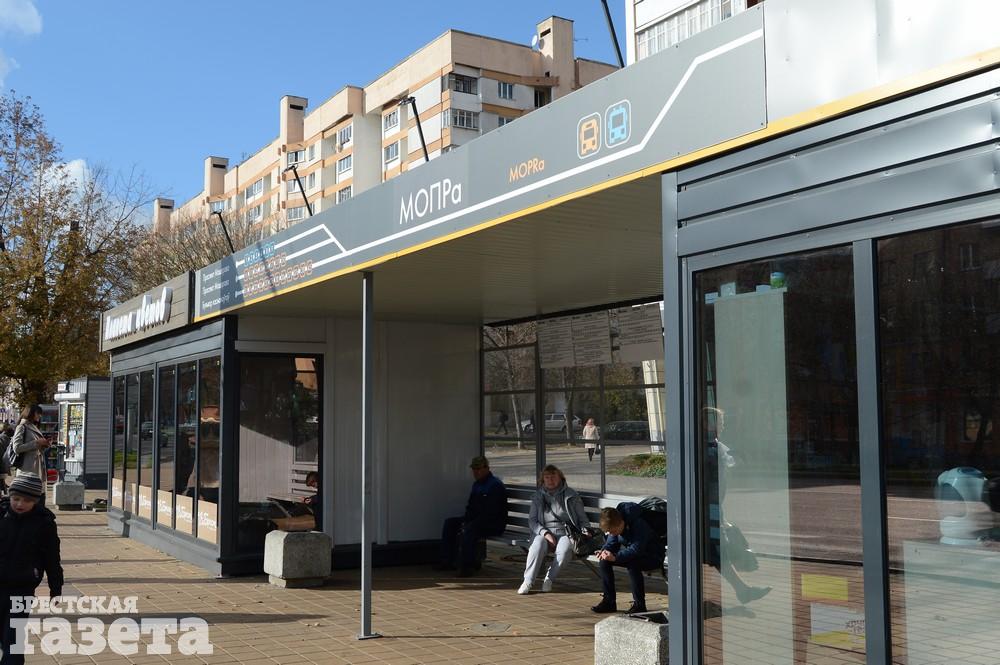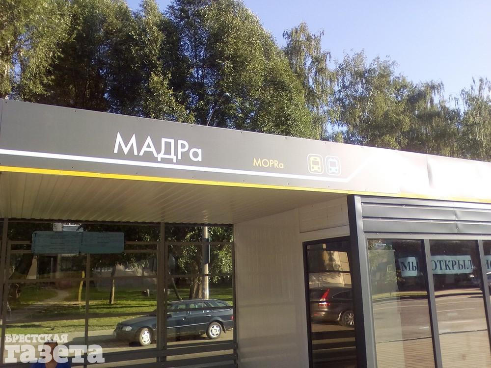 Напомним, к 1000-летию в Бресте обновляли остановки общественного транспорта. В конце лета изменения коснулись и остановок МОПРа. На них установили новые типовые павильоны ожидания и подписали название на латинице, транслитерируя с русского языка, и на белорусском – МАДРа.