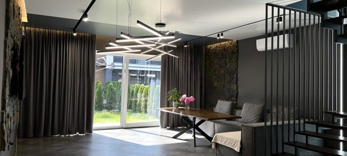 Квартира 2020 года постройки состоит из двух этажей и мансарды. Общая площадь — 145,7 кв. м, а жилая составляет 73,7 кв. м. На первом этаже разместились большая гостиная с выходом во двор, кухня, совмещенный санузел и тамбур. В интерьере преобладают глубокие темные тона, но за счет природных текстур внутреннее убранство выглядит не мрачным, а весьма уютным. Особый колорит придает декор из камня на стене и необычные хайтековские светильники.