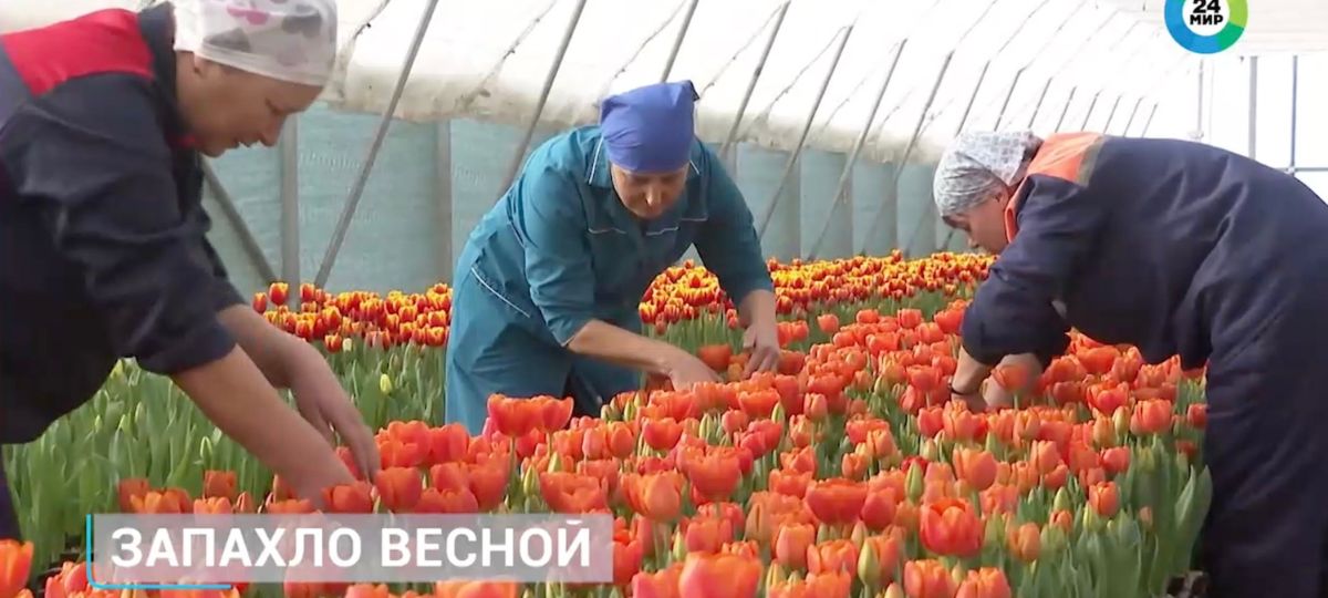 Тюльпаны в теплице Ивацевичского опытного лесхоза. Скриншот с сюжета «Мир24».
