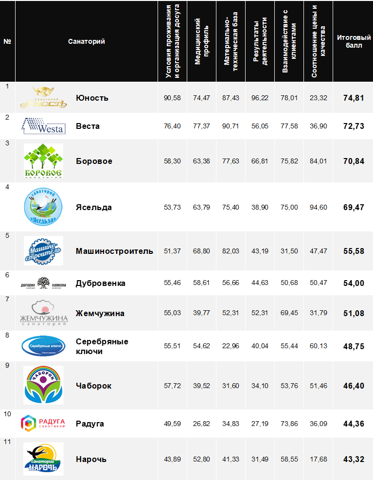 Оценивались как условия проживания, так и медобслуживание, взаимодействие с клиентами и так далее. Больше всего баллов набрал санаторий «Юность» (Ратомка). Попали в рейтинг и два санатория, которые находятся на территории Брестской области. Это санаторий «Ясельда» в Пинском районе (4-е место) и «Чаборок» в Барановичском (9-е место).