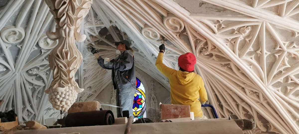 После открытия каплица сможет принимать туристов не только снаружи, но и внутри — там планируется экспозиция. Главная «изюминка» интерьера — кружевная лепнина, которой мастера возвращают былое великолепие.