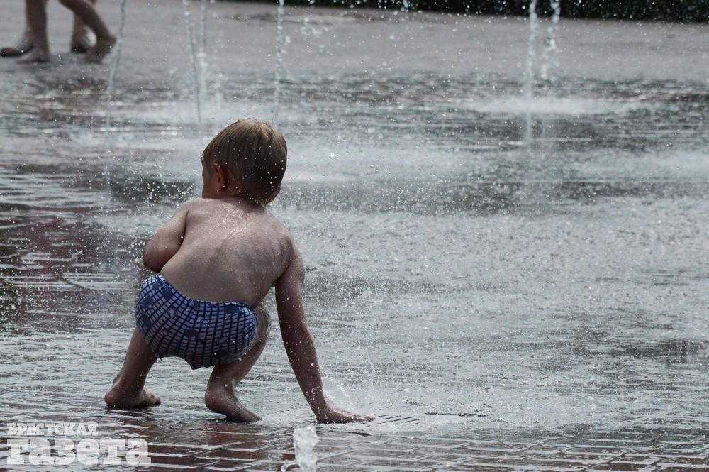 Многие резвятся в фонтане на набережной: кто в одежде, кто в купальниках и плавках, а самые маленькие — и голышом.