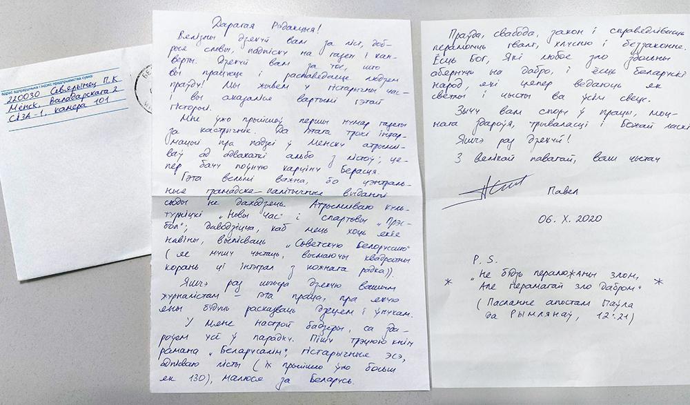 «Дарагая Рэдакцыя! Вялізны дзякуй вам за ліст, добрыя словы, падпіску на газету і канверты. Дзякуй вам за тое, што вы працуеце і расказваеце людзям праўду! Мы жывём у гістарычны час – і вы аказаліся вартымі гэтай гісторыі.