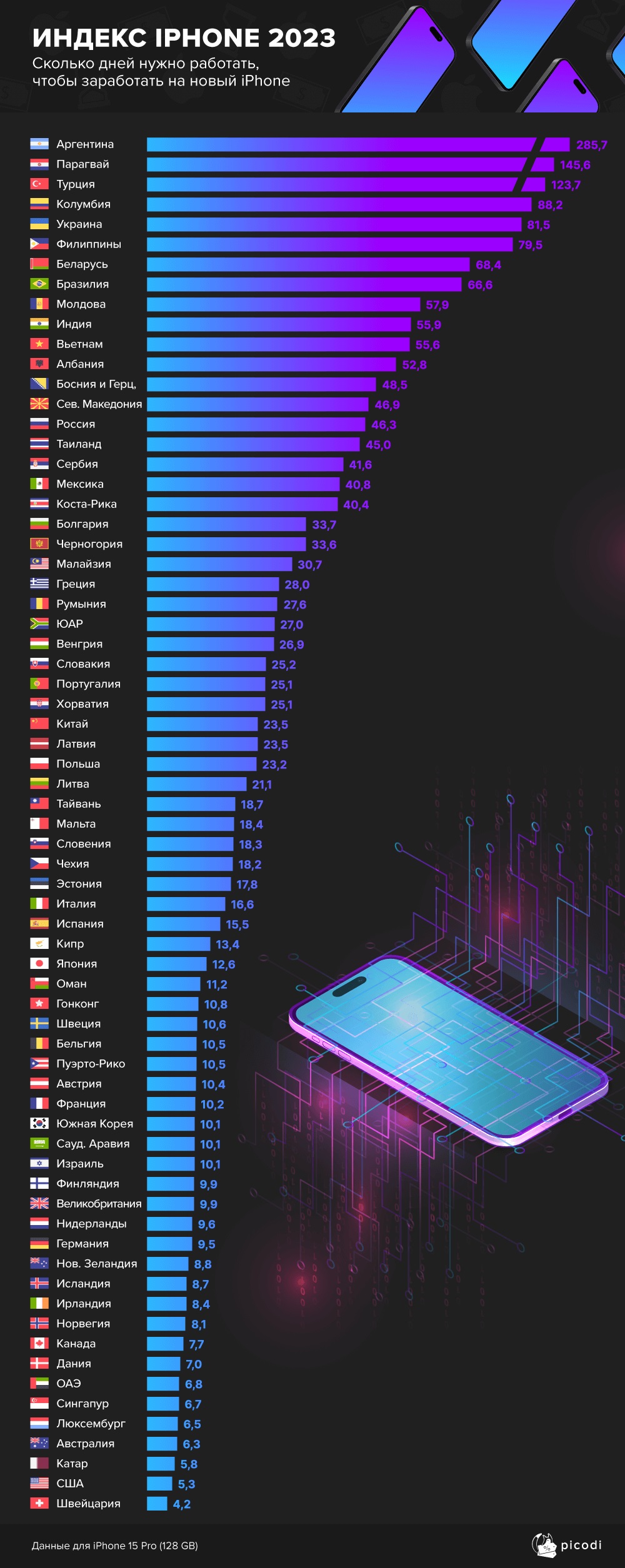 Среди стран, попавших в рейтинг, худший результат у Аргентины, где новый флагманский iPhone равен 285,7 трудодней. Парагвай и Турция занимают второе и третье место с конца с результатами 145,6 и 123,7 соответственно.