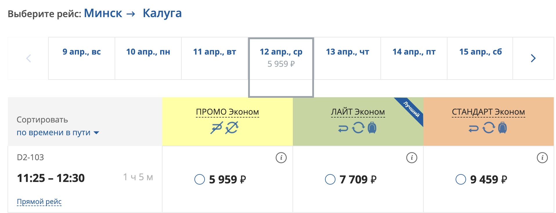 Стоимость апрельского билета из Минска в Калугу начинается от 5 989 российских рублей, или 183 беларуских рубля. Время перелета — 1 ч. 5 мин. Билеты доступны на сайте авиакомпании «Северсталь Авиа».