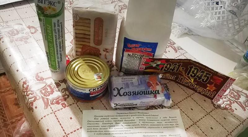 В «набор» вошли зубная паста, печенье, пачка манной крупы, банка скумбрии и кусок мыла. К нему прилагается поздравление, подписанное главой администрации Московского района города Бреста Вячеславом Дашкевичем и председателем совета Московской районной организации ветеранов города Бреста Николаем Леоновым.