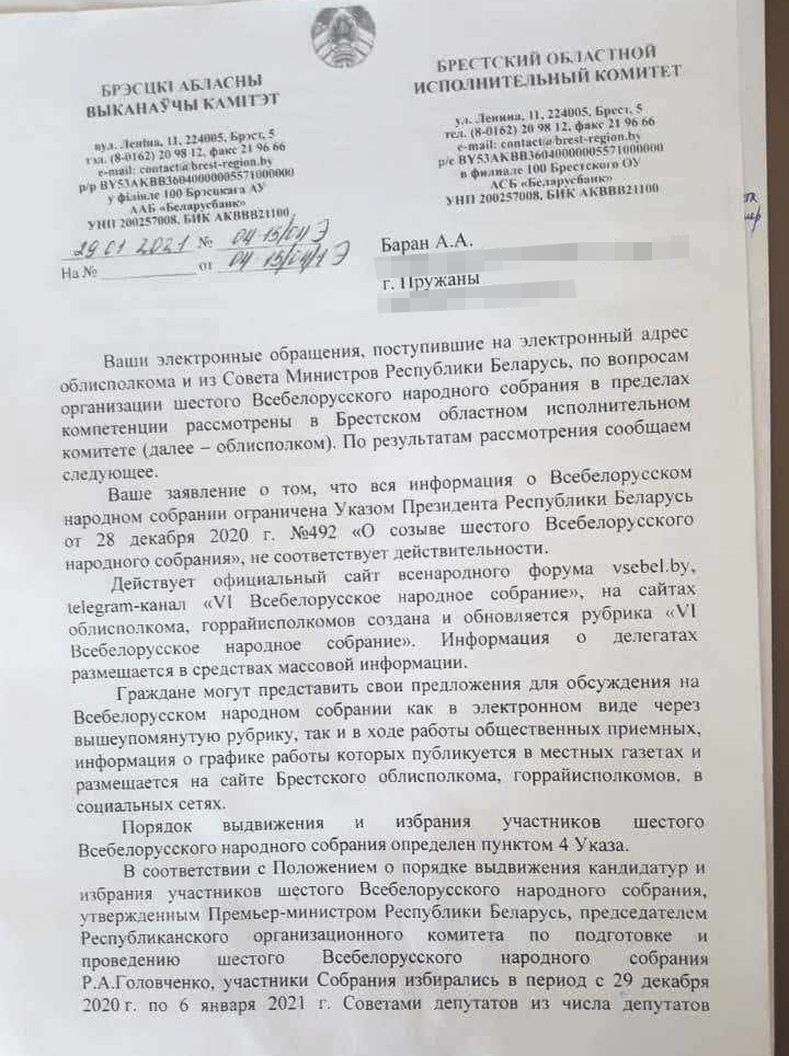 В жалобе Анны на действия (бездействия) должностного лица говорится, что в январе 2021 года она отправляла электронные обращения на адрес Брестского облисполкома и Совета министров (спустил на облисполком – прим. ред.), чтобы ей пошагово объяснили, как образом она может принять участие в шестом ВНС, детально описать полномочия собрания, «так как ясно это не описано ни в одном законодательном акте», детально описать повестку шестого ВНС и конкретные решения, которые планируется на нем принять. В ответе, который пришел за подписью заместителя председателя облисполкома Геннадия Борисюка, по мнению заявительницы, нет ответов по существу. По ее мнению, чиновник формально отнесся к ее обращению и ограничил ее право на получение полной, достоверной информации о деятельности государственных органов, общественных объединений, политической жизни.
