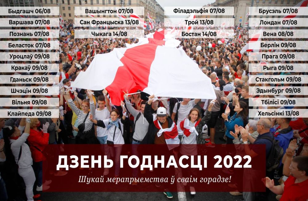 Международная акция беларуской диаспоры «Дзень годнасці» против диктатуры Лукашенко запланирована в 26 городах по всему миру: Быдгощ, Белосток, Варшава, Познань, Брюссель, Лондон, Вашингтон, Филадельфия, Вена, Вильнюс, Вроцлав, Краков, Гданьск, Щецин, Клайпеда, Рига, Берлин, Прага, Тбилиси, Стокгольм, Эдинбург, Хельсинки, Трой, Сан-Франциско, Чикаго и Бостон.