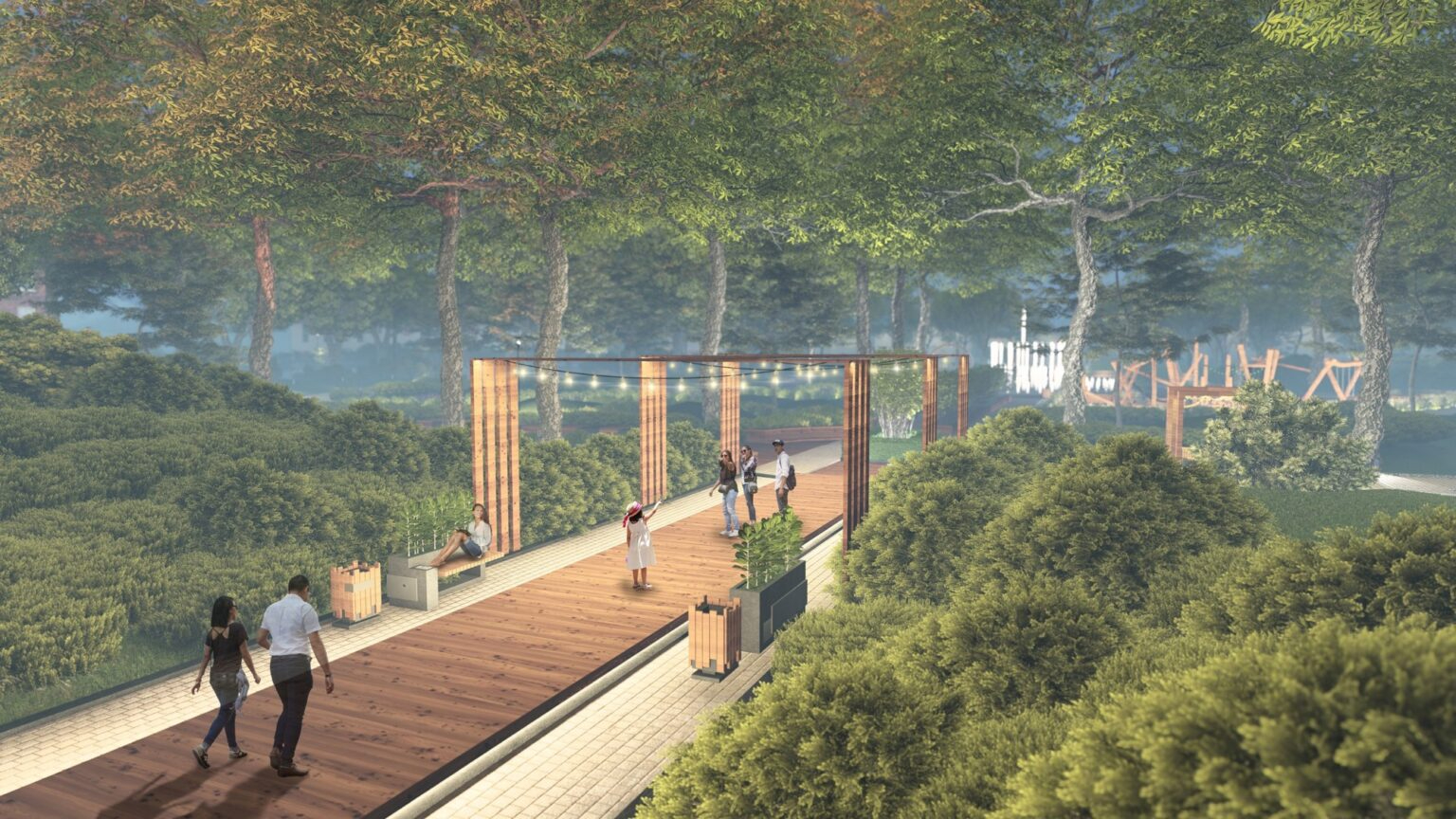 В первом проекте студенты выделили основные пешеходные маршруты, которые проложили люди, осталось их оформить в твердых покрытиях. В самом парке спроектировали несколько зон: бар, кафе, детская площадка, ярморочная зона, зеленая тропа, гамаки, парк скульптур и пруд.