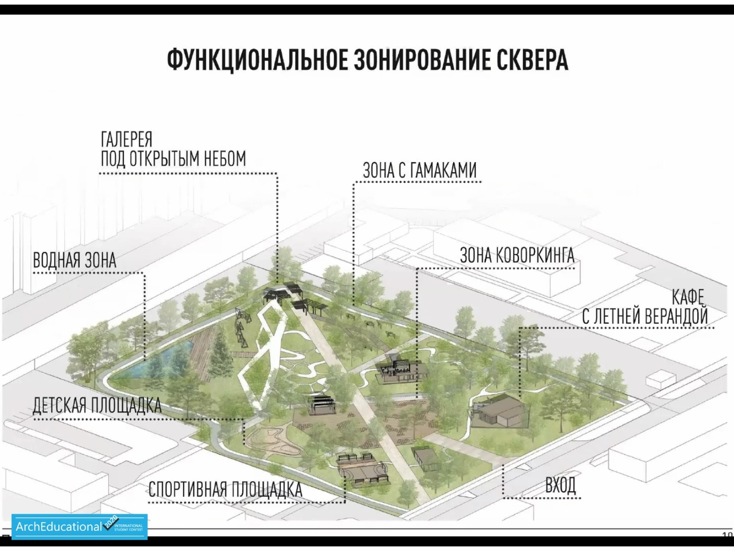 В проекте «Полесский сквер» конкурсанты предложили максимально сохранить существующее озеленение и создать комплексную благоустроенную среду для отдыха, спорта и социального взаимодействия. Для этого ребята разработали следующие зоны: галерея под открытым небом, зона с гамаками, коворкинг, кафе с летней верандой, водная зона, детская и спортивная площадки.