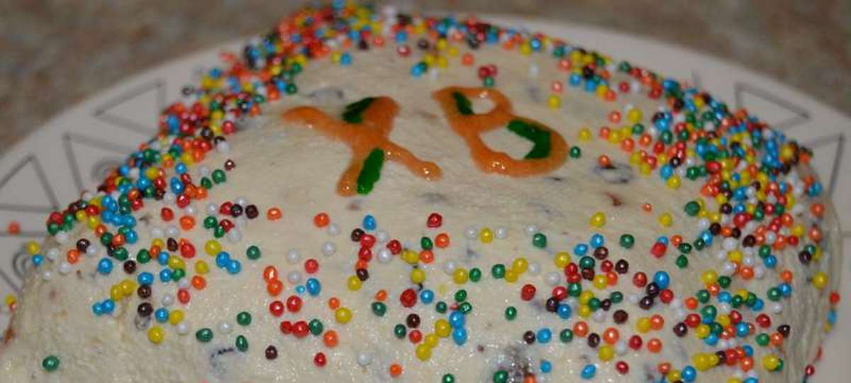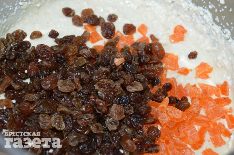 Надо: 350 г творога 9% жирности, 150 г жирной сметаны (от 20%), 2 сырых яичных желтка, 100 г сахара, 2 г ванилина, 100 г изюма, 100 г цукатов.