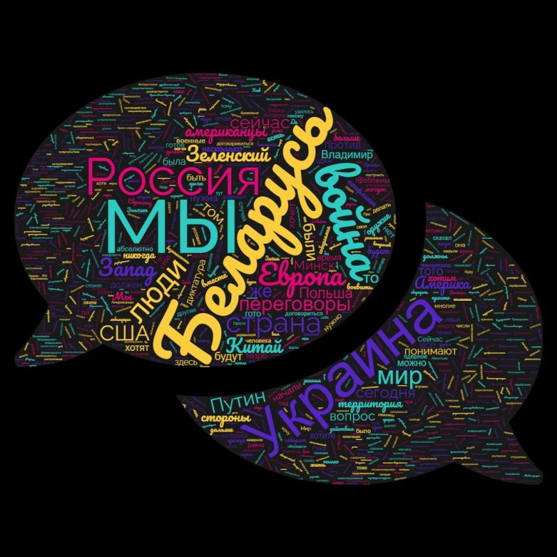 Как видно на картине, чаще всего Лукашенко произносил слова «мы», «Беларусь», «Украина», Россия», «война», «люди», «страна», «Европа», «мир», «Запад», «США», «переговоры». «Зеленский», «Путин» и «Китай».