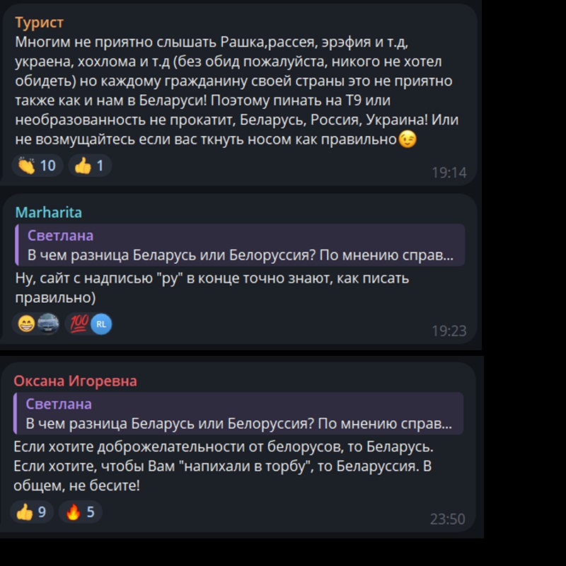 Читайте также: «Сам ты Белоруссия». Как в приграничных чатах беларусы злятся и учат россиян правильно писать название нашей страны