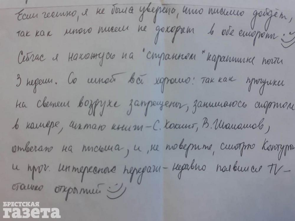 Читайте также: «Огромный привет всем брестчанам! Вы – огонь!» – написала Мария Колесникова в письме «Брестской газете»