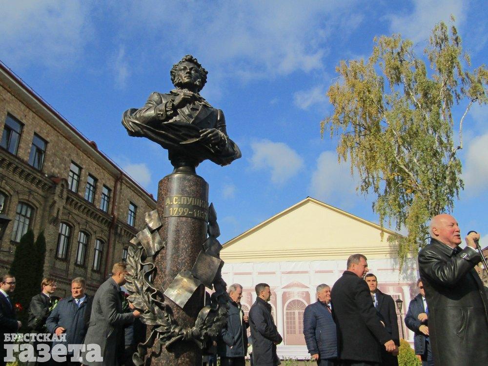 В Бресте возле старого корпуса БрГТУ открыли памятник Пушкину и одноименный скверик — такой подарок 1000-летнему Бресту сделало российское военно-историческое общество.