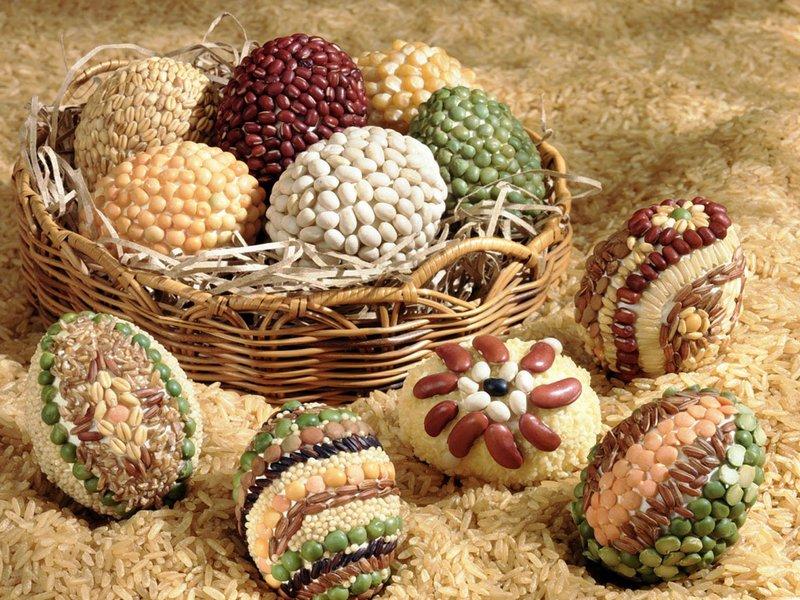 Пасхальные яйца можно украсить с помощью обычной крупы. Для этого подойдут рис, пшено, гречка, горох, чечевица, молотая кукуруза. Можно использовать кондитерскую посыпку из цветной глазури или шоколада, мелкую лапшу в виде звездочек и даже бисер. Для закрепления мелких деталей на скорлупе понадобится восковая или парафиновая свеча.