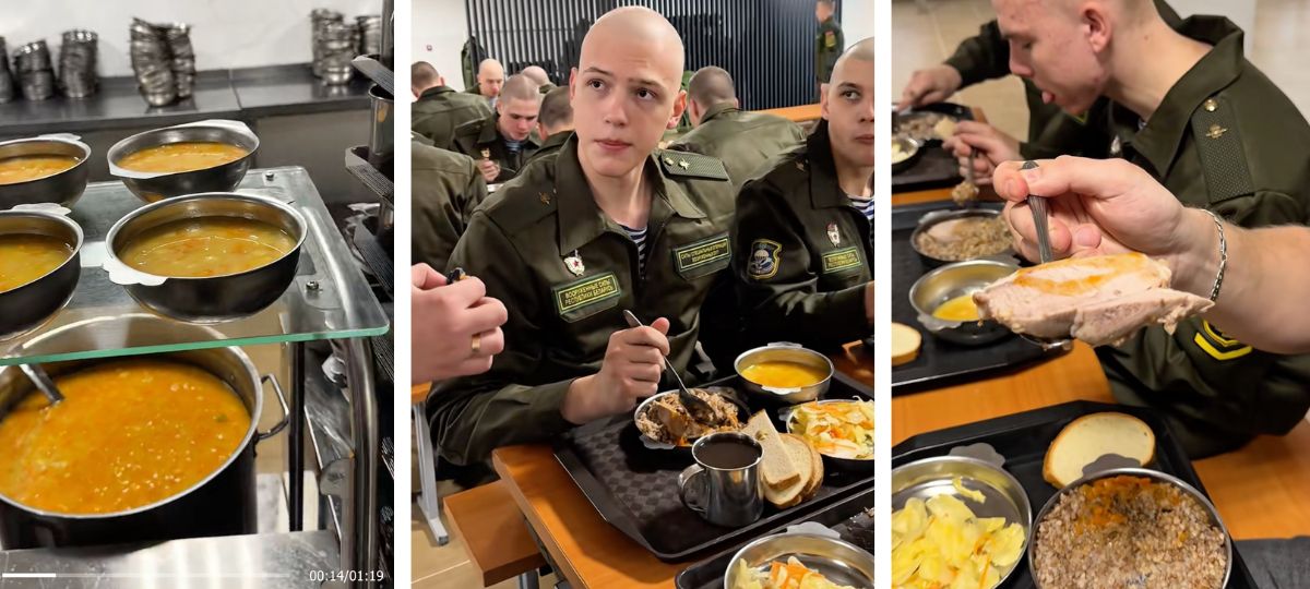 Он подробно показывает, как солдаты берут суп, мясо и гарнир, отмечая, что «за такой обед в гражданской столовой пришлось бы заплатить 10–15 рублей». Также блогер демонстрирует возможность взять чеснок или лук «для профилактики заболеваний».