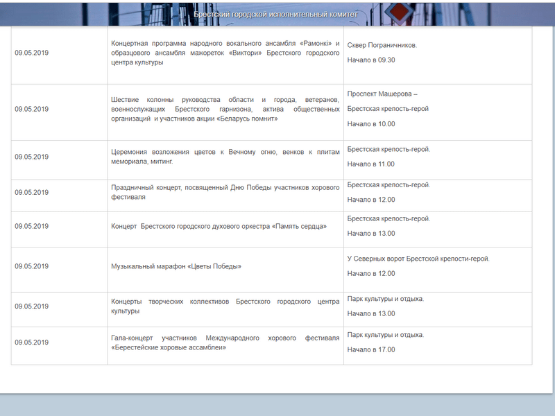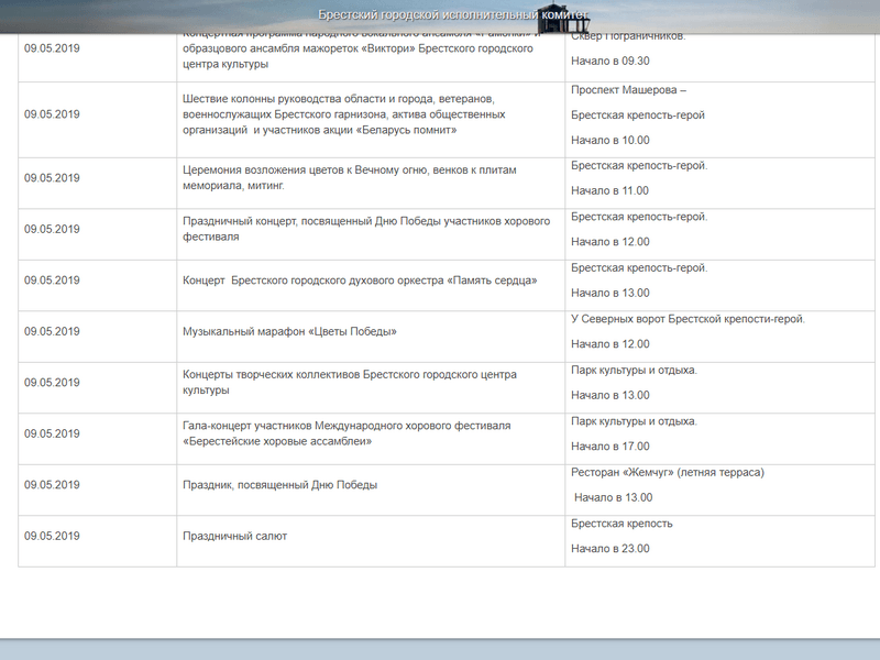 «БГ» в пятницу 3 мая опубликовала у себя на сайте программу празднования в Бресте Дня Победы. Информацию мы взяли на официальном сайте Брестского горисполкома. Она была размещена 2 мая, и последним мероприятие 9 мая значился гала-концерт участников Международного хорового фестиваля «Берестейские хоровые ассамблеи», который должен начаться в парке культуры и отдыха в 17.00. Т. е. праздничного салюта в программе не было.