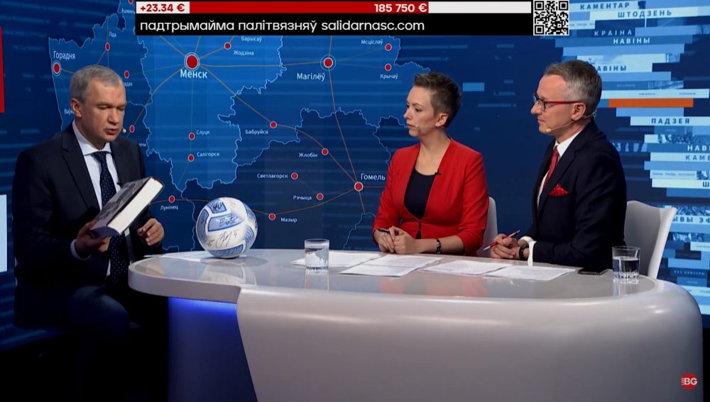 Далее в эфире марафона появился руководителя НАУ Павел Латушко. Он пришел с лотами, деньги с которых пойдут на поддержку политзаключенных. Например, футболисты «Динамо-Киев» подарили Павлу Латушко футбольный мяч со своими автографами. Более подробно о лотах НАУ можно узнать здесь. А представители НАУ персонально перечисляют 1 500 евро на поддержку политзаключенных в рамках онлайн-марафона.