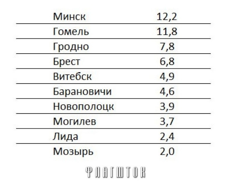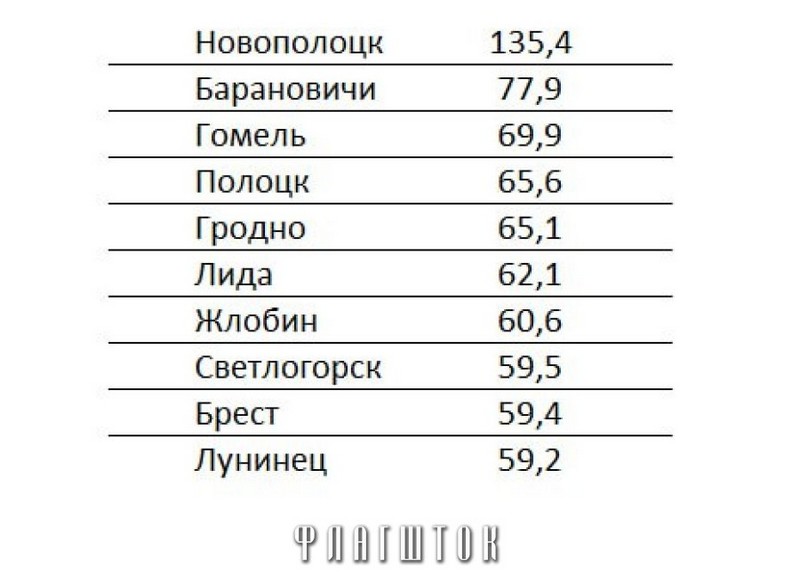 Второе место занимают Барановичи, где замечено как минимум 156 случаев на 200 тысяч населения района. А вот Брест и Лунинец занимают в топе последние строчки — 59,4 и 59,2 случаев на 100 тысяч населения.